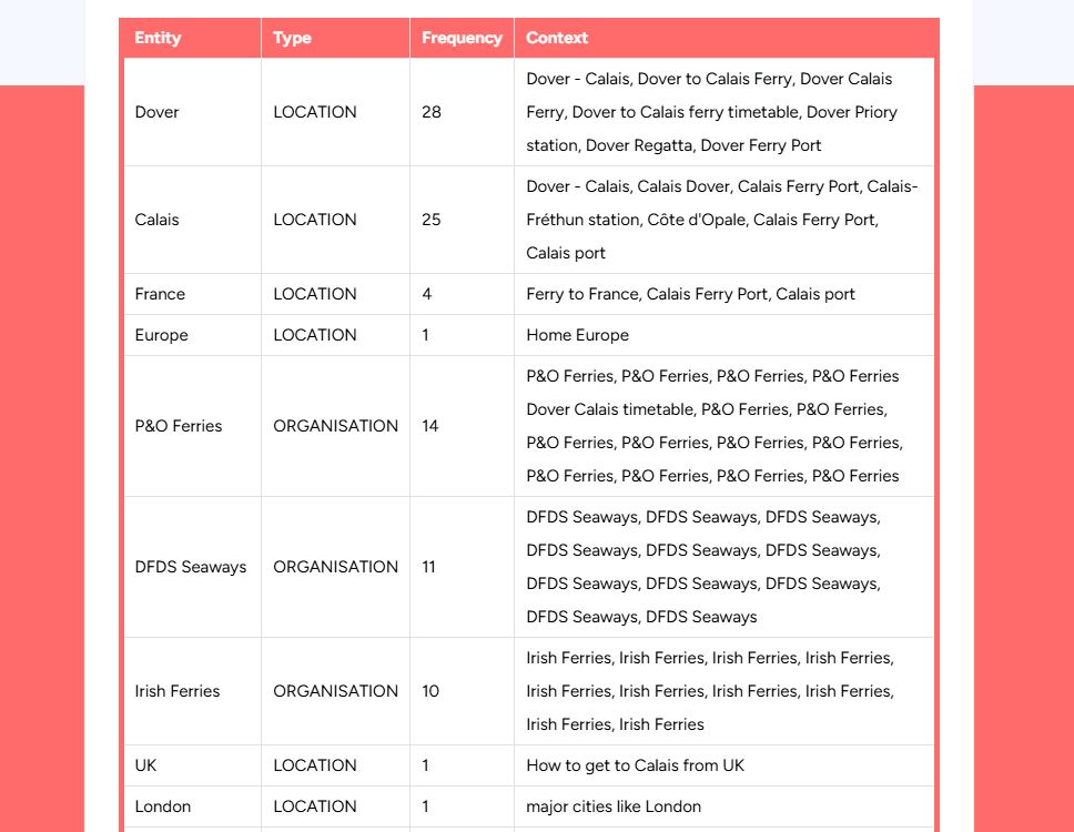 Search engines are increasingly focused on entity recognition and context, not just keywords. The Entity Analyser helps you understand what entities (people, places, topics, concepts) are present in your content, how they compare to high performing pages and what you might be missing.